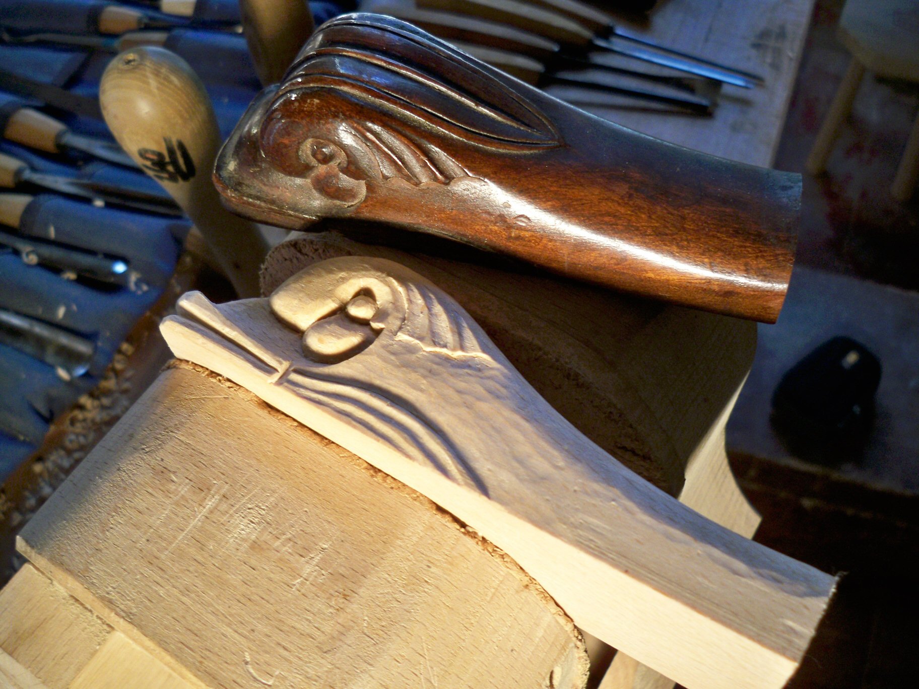 Je fais également la finition du bois : la mise en cire (cire faite par l’atelier avec une apicultrice de L’Aigle), ainsi que le vernis aux tampons. |